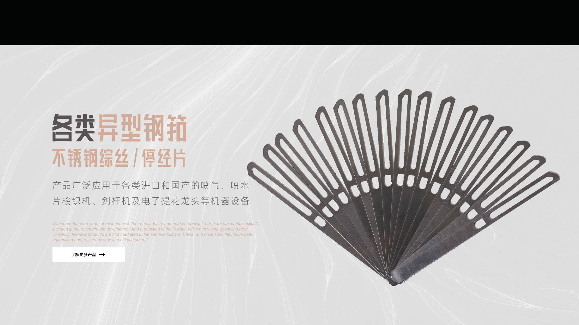 憑借十多年鋼筘行業(yè)經(jīng)驗(yàn)及對(duì)市場(chǎng)的前瞻性,我們團(tuán)隊(duì)滿懷熱情的投入到豐田JAT810新型節(jié)能鋼筘的研發(fā)和生產(chǎn)當(dāng)中,目前新產(chǎn)品在國內(nèi)同行業(yè)中先行上市銷售,一經(jīng)銷售就得到了新老客戶的認(rèn)可和好評(píng)!